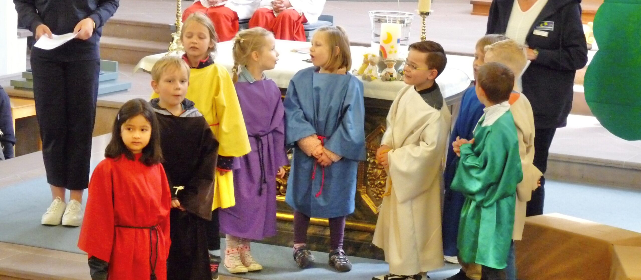 Die Feierlichkeiten starteten mit einem Familiengottesdienst in der Pfarrkirche St. Heinrich und Kunigunde. Pfarrer Tobias Dirksmeier wurde dabei tatkräftig von den über 70 Kindern der KiTa unterstützt – mit vielen Liedern, passenden Bewegungen und auch einer schauspielerischen Einlage. Gott in die tägliche Arbeit mit den Kindern einzubeziehen war und ist, ebenso wie das am christlichen Menschenbild orientierte, pädagogische Handeln nach dem gewählten Leitspruch „Wir sind alle dazu bestimmt zu leuchten!“ (v. Nelson Mandela), der KiTa-Leiterin Manuela Linde und ihrem Team besonders wichtig – und das nicht nur als „Vorbereitung“ auf diesen Festtag. „Die Identifikation der Kinder mit ihrer KiTa war deutlich beim Gottesdienst zu spüren“, freute sich Manuela Linde. „Sie waren mit so viel Eifer bei der Sache und haben mit voller Begeisterung mitgesungen, vor allem bei der „Hymne“ der Katholischen Kindertageseinrichtungen mit dem Titel „Kunterbunt“.
