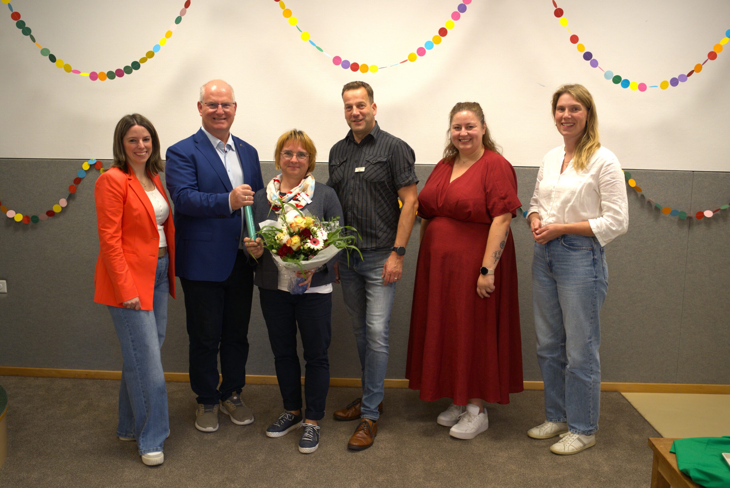 Den Staffelstab überreichte Träger-Geschäftsführer Detlef Müller (2. von links) an die neue Kita-Leitung Stefanie Volmer-Dömer. Mit dabei waren (auch v. links) Frau Wannemüller (Gemeindereferentin), Markus Heßbrügge (Pädagogische Regionalleitung), Chanel Mester (ständige stellv. Leiterin) und Lena Agethen-Stieren (Vertreterin Elternbeirat).