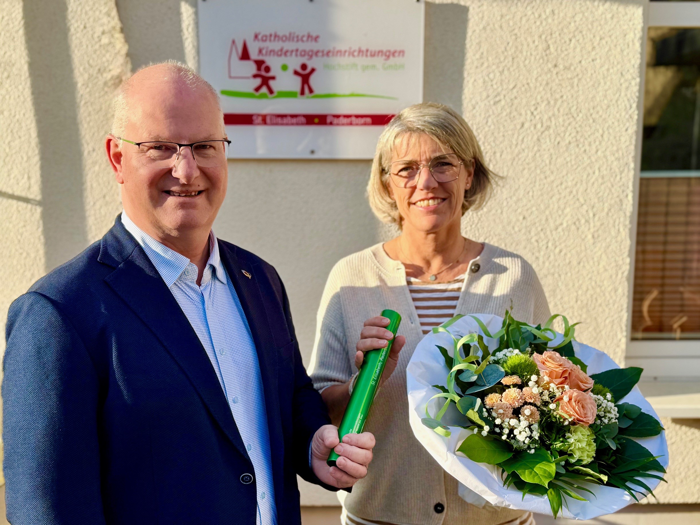 Paderborn. In einer kleinen Feierstunde beglückwünschte der Geschäftsführer der Kath. Kindertageseinrichtungen Hochstift gem. GmbH, Detlef Müller, die neue Kita-Leitung der Einrichtung St. Elisabeth, Inga Fischer, mit den Worten „Ich wünsche Ihnen viel Erfolg. Seien Sie mutig und selbstbewusst“ zu ihrer neuen Aufgabe. Unter Bezug auf das Franz von Assisi zugeschriebene Zitat „Tu erst das Notwendige, dann das Mögliche, und plötzlich schaffst du das Unmögliche“ überreichte er der neuen Leiterin Blumen, ein Geschenk sowie einen symbolischen Staffelstab. Dieser stehe – angelehnt an den Staffellauf im Sport – für eine starke Mannschaft. Gemeint sei damit das Zusammenspiel von Elternschaft, Kita-Team und Kirchengemeinde. „Alle gehen gemeinsam an den Start“, so Müller und gleichzeitig empfahl er Inga Fischer, Strecke und Ziel stets als Team zu definieren und in bestimmten Situationen auch einmal „den Stab an andere zu übergeben“. Inga Fischer war viele Jahre als pädagogische Fachkraft in der Einrichtung der katholischen Kindertageseinrichtungen Hochstift gGmbH in Benhausen tätig. Schon seit längerer Zeit hegte sie den Wunsch, eine Kita-Leitung zu übernehmen. Als sich diese Möglichkeit in St. Elisabeth bot, wechselte sie von der größeren  Einrichtung in Benhausen in die dreigruppige Kita St. Elisabeth in der Pankratiusstraße. Schon in den ersten Wochen nach ihrem Start in St. Elisabeth Mitte November sah sich Inga Fischer mit unerwarteten Aufgaben konfrontiert. „Es war schon eine große Herausforderung“, berichtet Fischer, „doch ich wurde hier in St. Elisabeth mit offenen Armen empfangen und habe viel Unterstützung erfahren.“ Dafür bedankte sie sich ausdrücklich beim gesamten Team.
