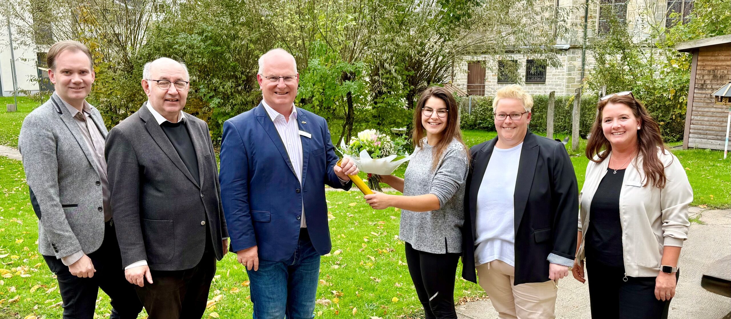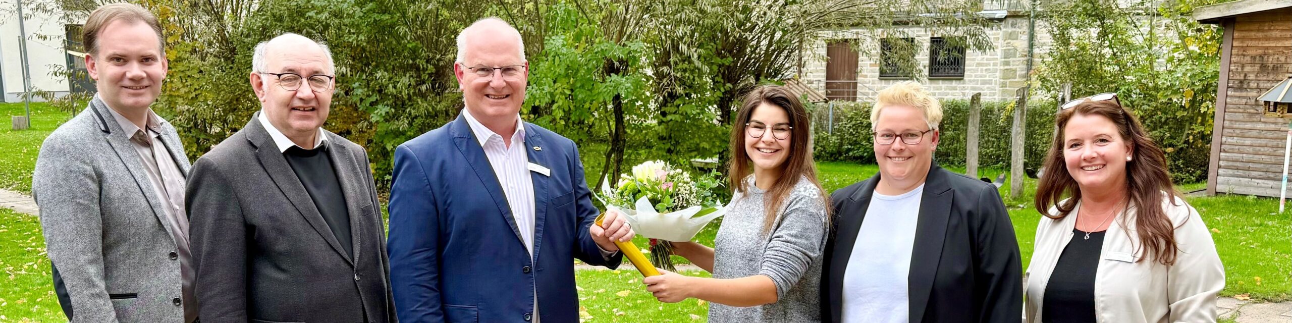 Träger-Geschäftsführer Detlef Müller überreicht der neuen Kita Leitung Nele Glade den Staffelstab (Mitte). Ebenfalls während der Feier waren anwesend (von links) Andre Hüsken, Gemeindereferent im Pastoralen Raum an Egge und Lippe, Pfarrer Georg Kersting, stellvertretende Kita-Leitung Kathrin Moors und Sandra Hanke, pädagogische Regionalleitung.